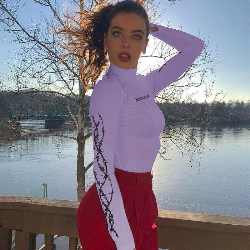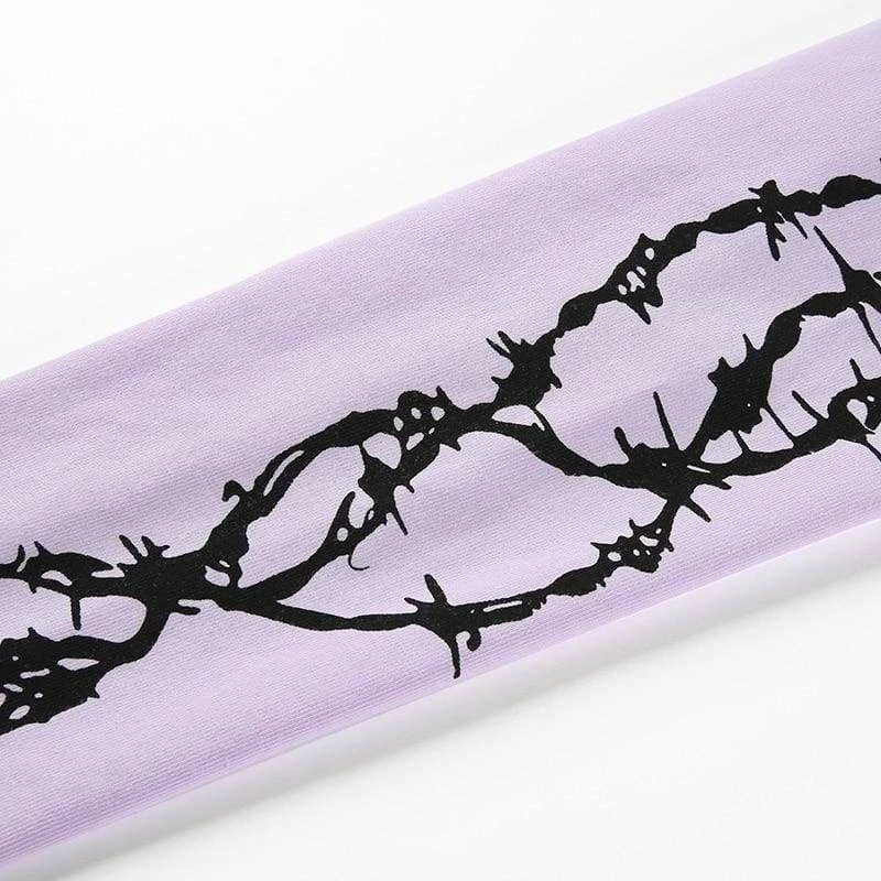 Looking for that E-Girl style? Then our Barbed Wire Crop Top is a must have this season. Featuring a high neckline, cropped fit and a barbed wire print down the sleeves with an old English style logo on the front you will totally stand out in this.