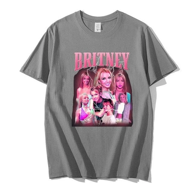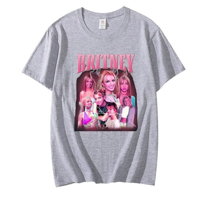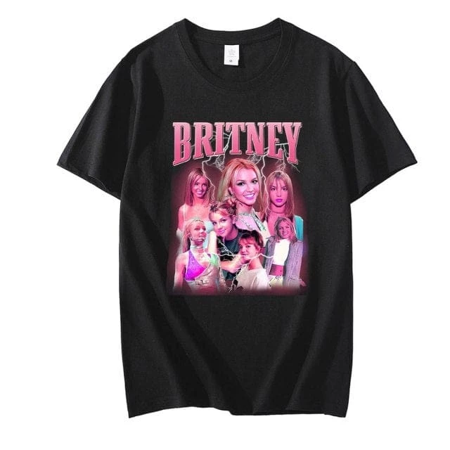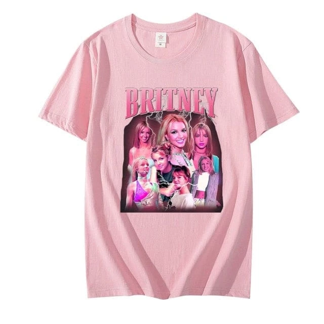 Pay homage to Britney Spears, one of the icons of Y2K fashion with our 90s style vintage homage T-Shirt. The design depicts multiple images of and some of her famous moments and style with a pink background. This premium tee is available in different colorways.