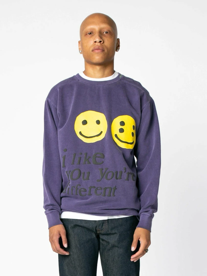 Cactus Plant Flea Market x Union I Like You You’re Different Crewneck sweatshirt is a must have crew neck! Available in light black and purple. It features the unique double smiley face design with the words “I Like You You’re Different” on the front.