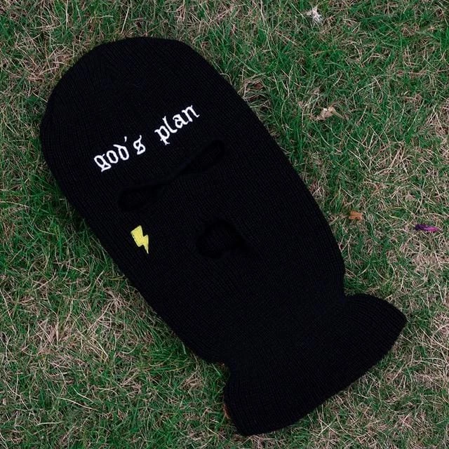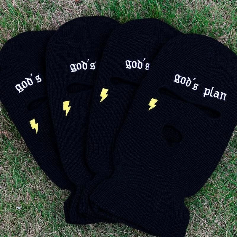 Give yourself the ultimate unique look with the Gods Plan Fashion Ski Mask! This balaclava comes in black and feature custom embroidery saying “Gods Plan” referencing one of Drake’s biggest hits! They also feature lightning under the eye. This a must have one of a kind streetwear piece.ย