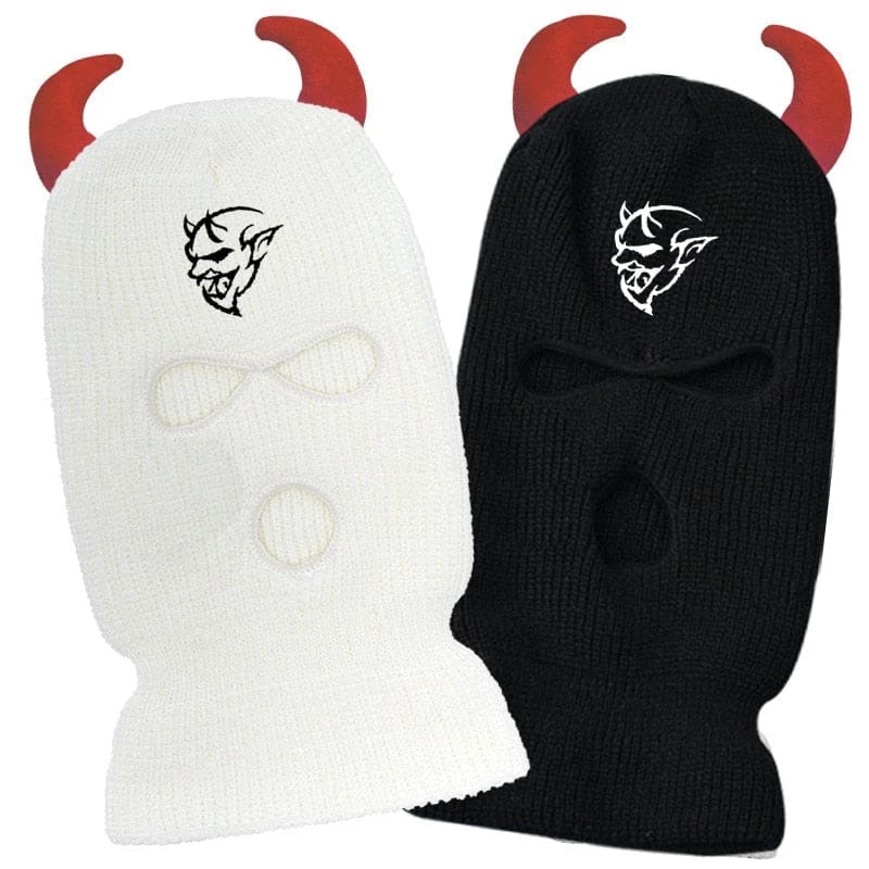 Our Horned Devil Ski Mask is a crazy look to make sure you fit in with the fashion ski mask trend. This 3 Hole Balaclava features a embroidered devil head above the eyes with attached padded red horns to give a truly evil vibe. One size fits all with it made from comfortable cotton.ย
