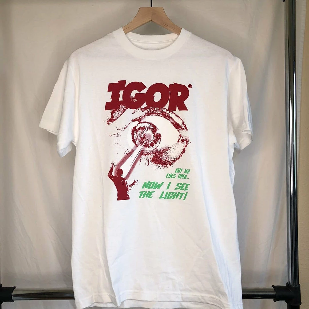 Get the Tyler The Creator look with the; Igor Tour Now I See The Light T-Shirt! Celebrating his 2019 Igor album and the subsequent tour the tees design seeing a giant red eye with the print saying “i got my eyes open now i see the light”.ย