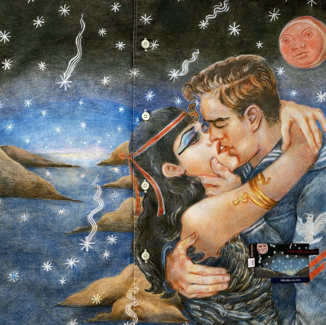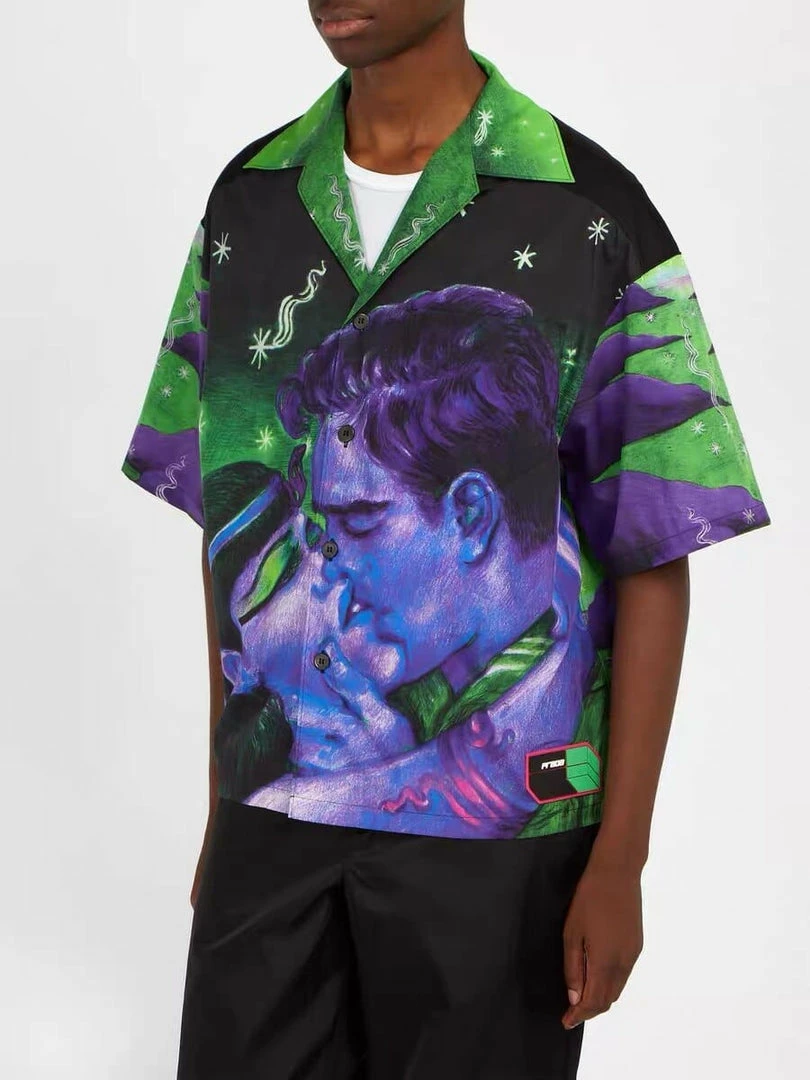 Secure the iconic Prada look with the Impossible True Love Bowling Shirt! Famously worn by celebrities like Asap Rocky this short sleeve shirt comes in two slightly different designs that both depict the same alien couple. This is a super limited must have style.
