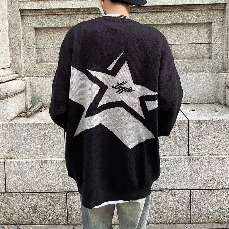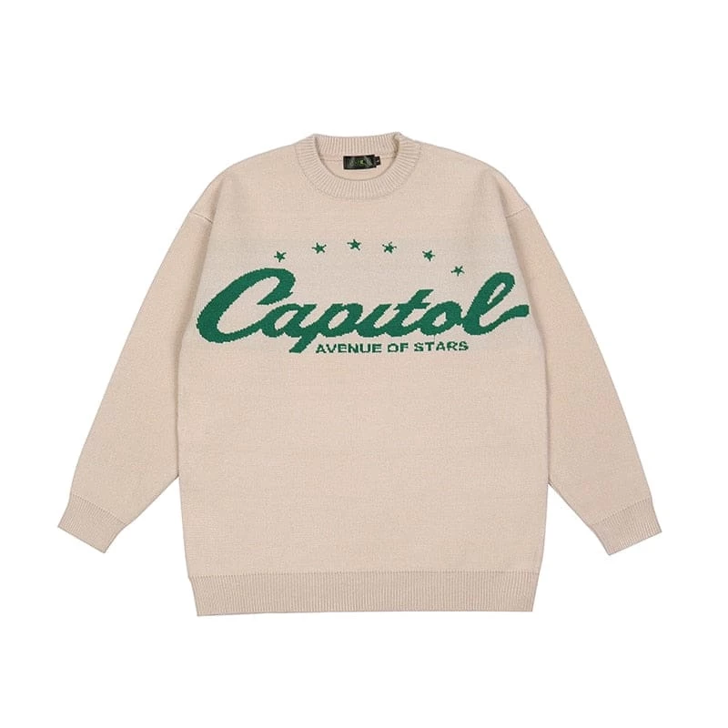 get the knit wear look with our Japanese Retro Avenue of Stars Sweatshirt! This jumper comes in two different color options black and khaki with a “capitol” front design and a large star on the back. This has been inspired by japanese streetwear fashion!