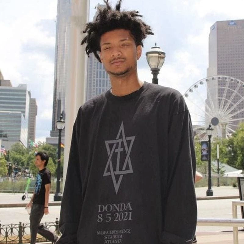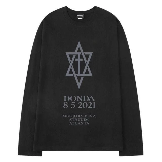 Celebrate the release of Kanye West Donda album with this limited edition must have tee. The Kanye West DONDA Listening Event Long Sleeve T-Shirt features cross star design with the date 8 / 5 / 21 and with print naming the listening party location mercedes stadium location.