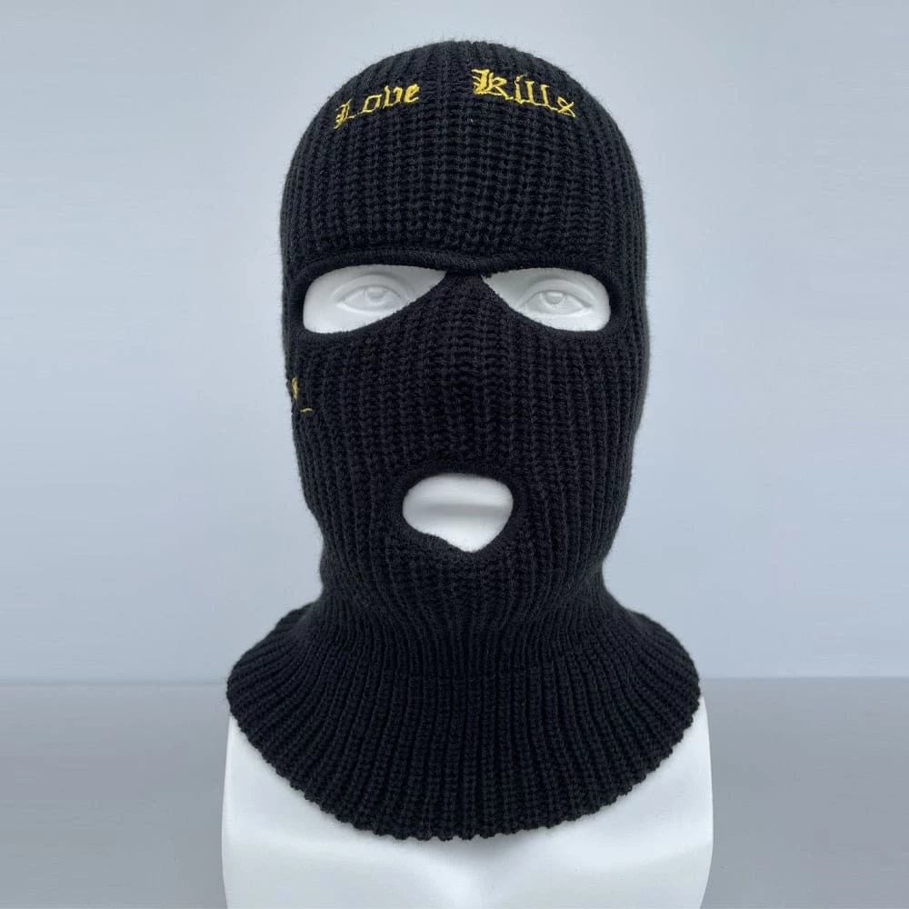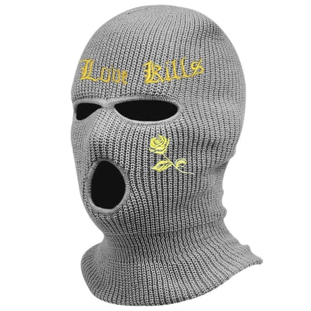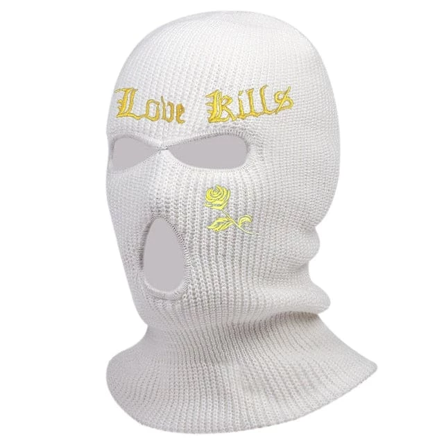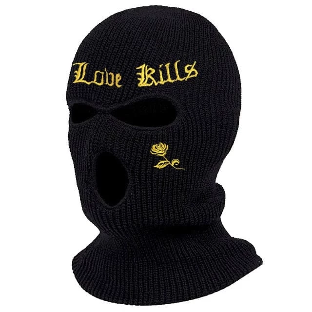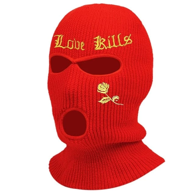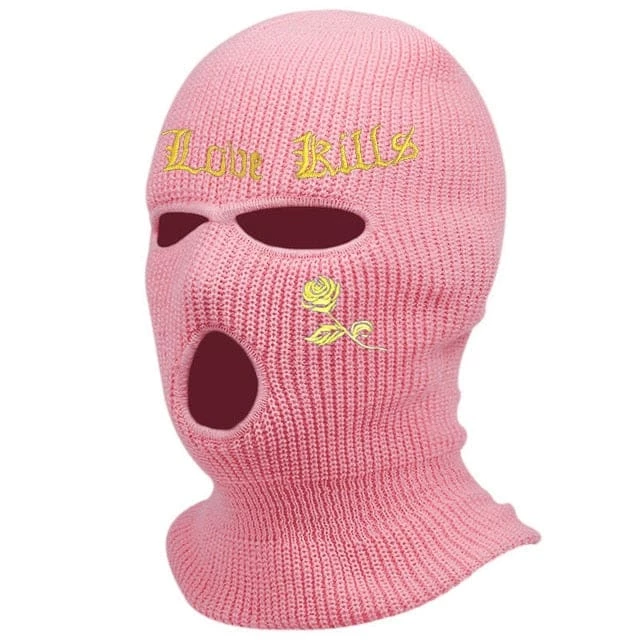 Our Love Kills Ski Mask with fit your fashion Balaclava needs, with its range of bright colors and embroidery. The 3-Hole Knitted Ski Mask is a one size fits all that is super comfortable, the design features “love kills” above the eyes with a Rose Flower below it.
