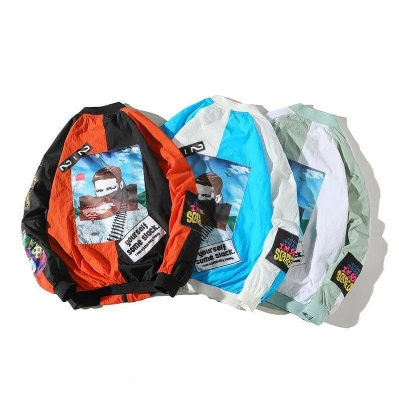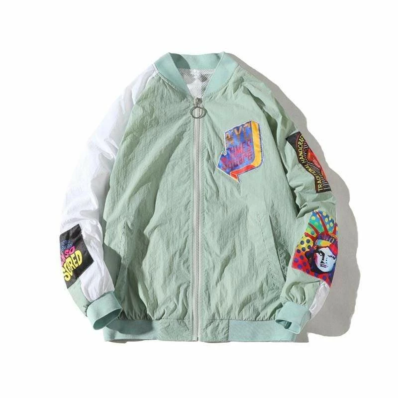 Our Modern Art bomber is bound to make a statement. Available in 3 colour ways: orange, sky blue & mint. Featuring urban badge detailing and artsy motifs, with a zip up front and elasticated hem. This bomber is an epitome of streetwear.