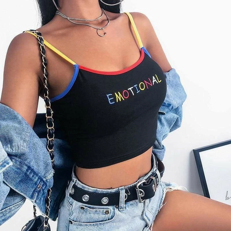 Girls it’s time to express your emotions in ourย Emotional Crop Tank Top! With a comfy fit and colorful design it’s bound to give you a unique streetwear look. This will look great with our range of jogger pants.