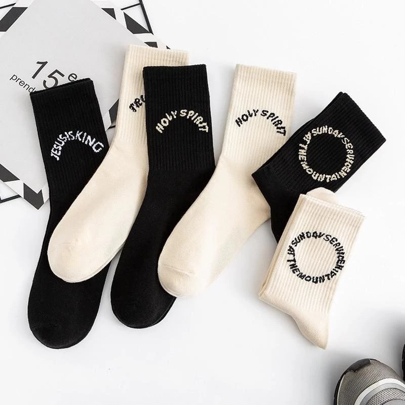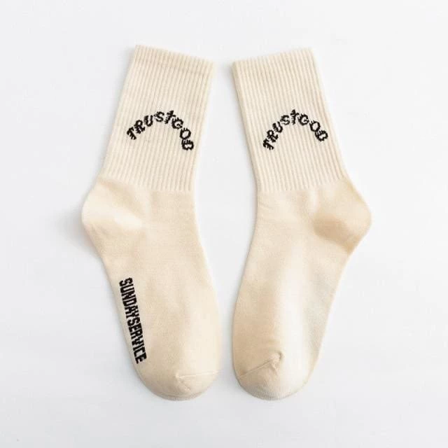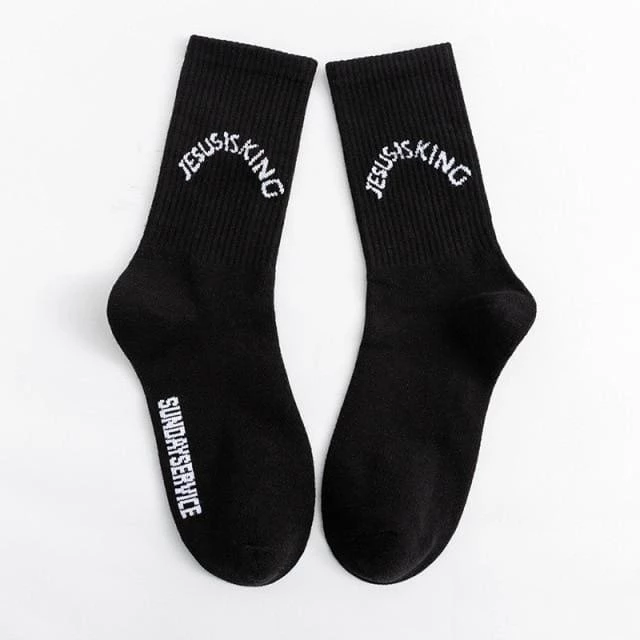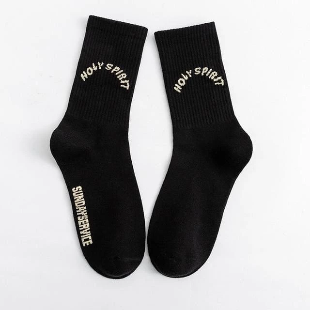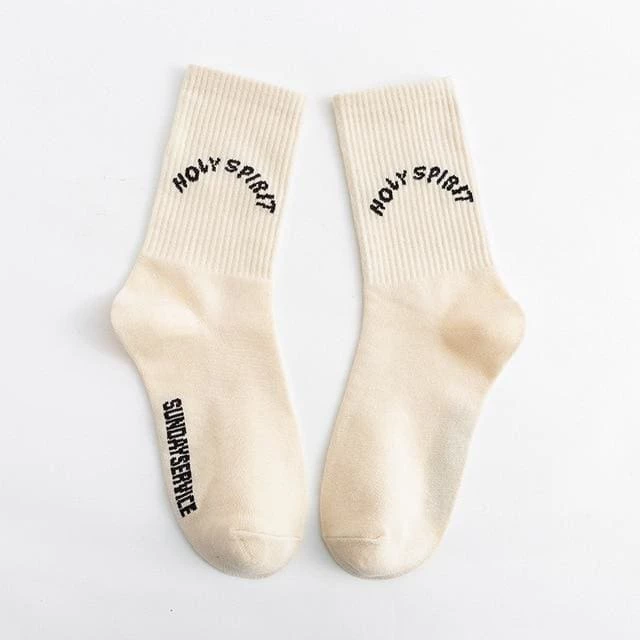 Get the Kanye West holy spirit look and trust god with our range of Kanye West Sunday Service Socks. Available in both black and beige each pair of socks features a unique reference to Kanye West’s jesus is king album.