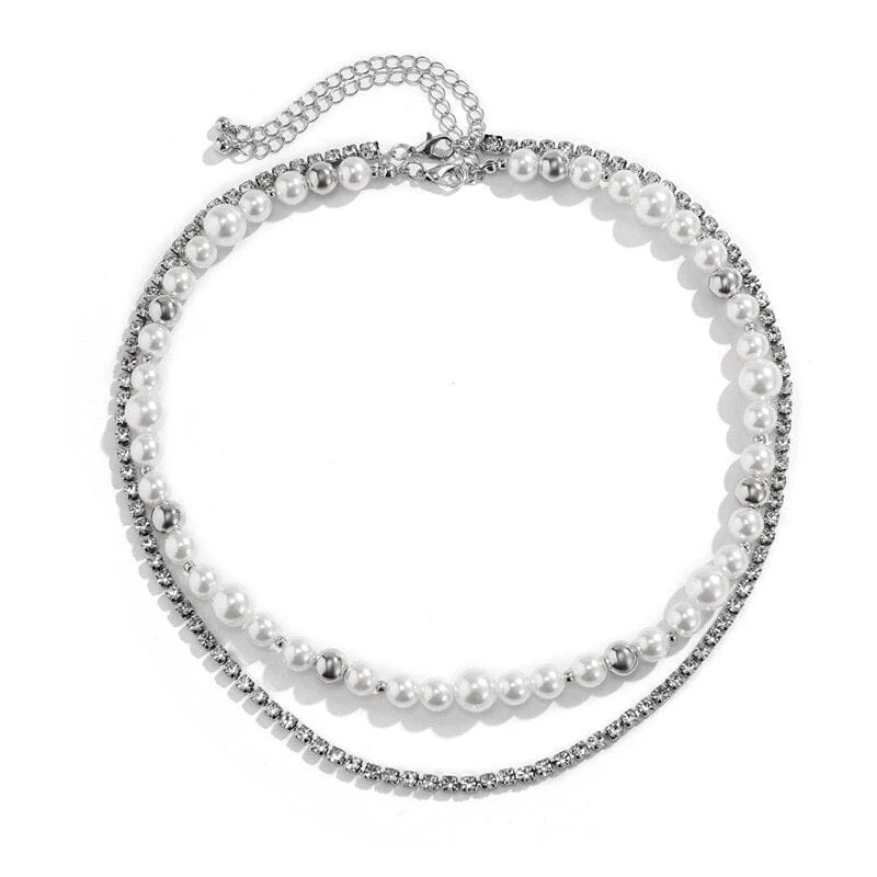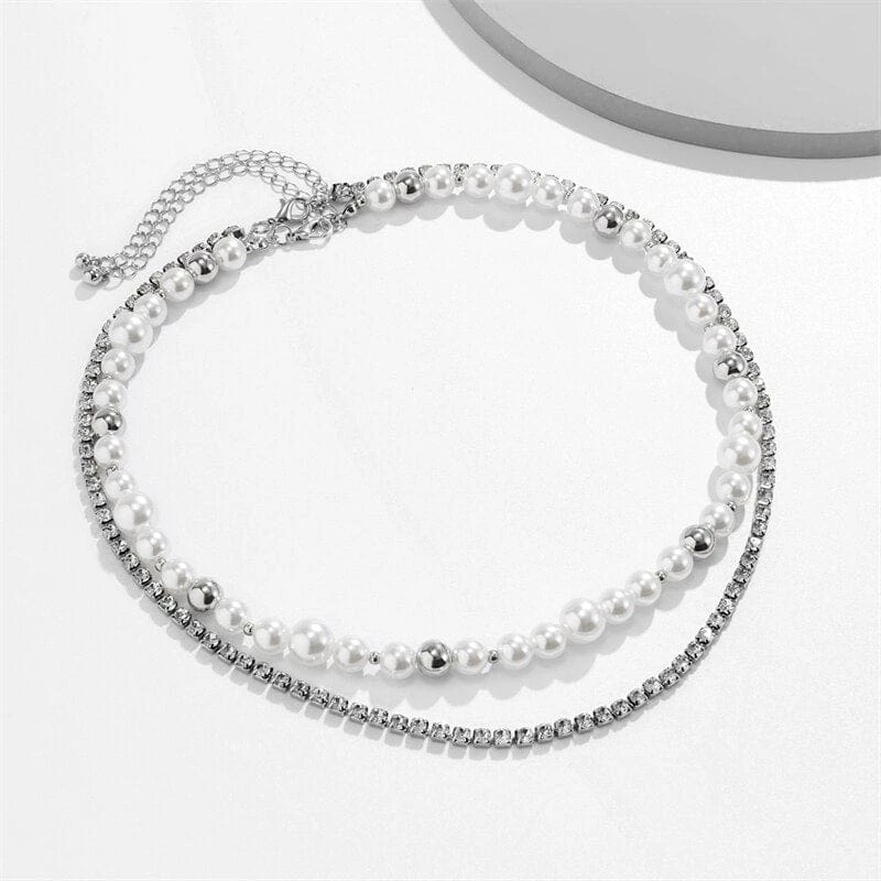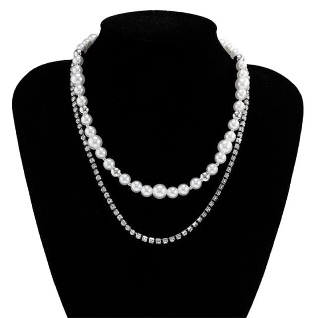 Give yourself a premium layered necklace look with is collection. Our Pearl Necklace Rhinestone Chain Set features two chains designed to be layed together or worn separately. the first chain features a mixture of different sized pearl beads with the second one a diamond life rhinestone tennis chain. Both fully adjustable.