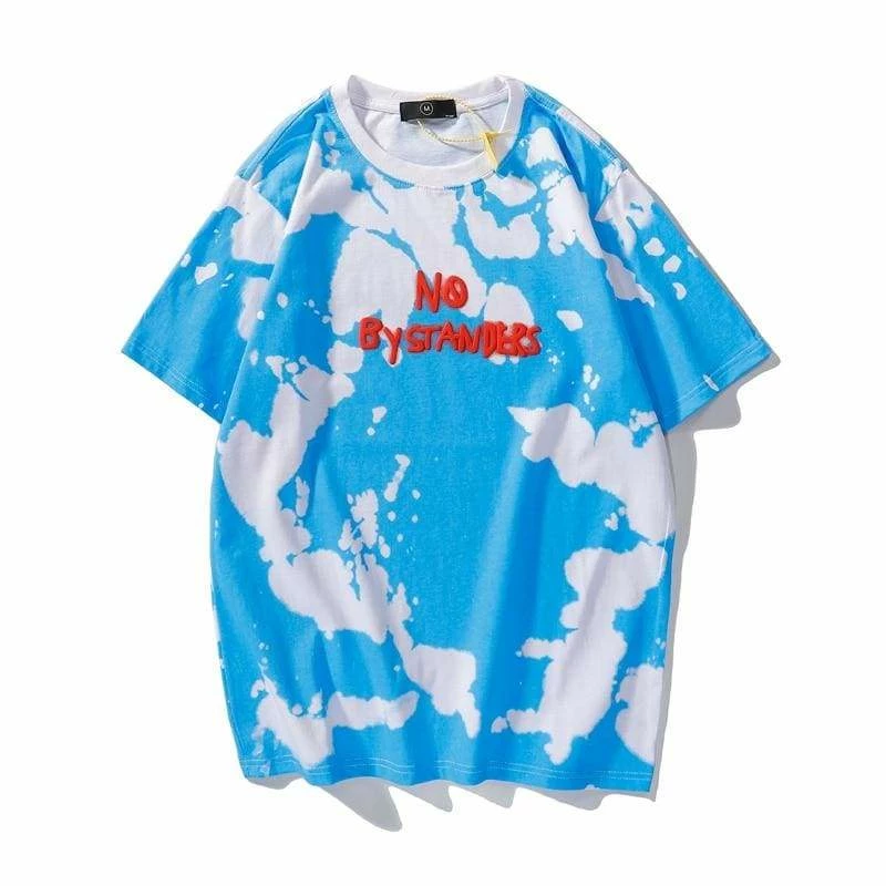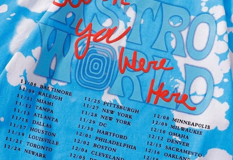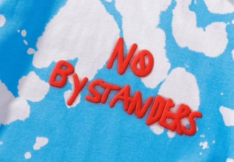 Capture the iconic Astroworld Travis Scott look with this tee straight from his Wish you were here tour collection. Travis Scott No Bystanders Tie Dye T-Shirt features embroidery on the front referencing his song “No Bystanders” from his hit album and with tour dates on the back.