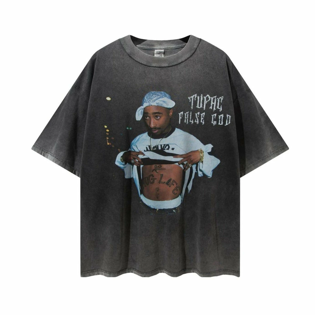 Celebrate the hiphop iconic Tupac with this vintage styled washed black tee! The Tupac False God Vintage T Shirt features a print of back on the front with print saying “false god” a reference to his music. Secure this limited look today.ย