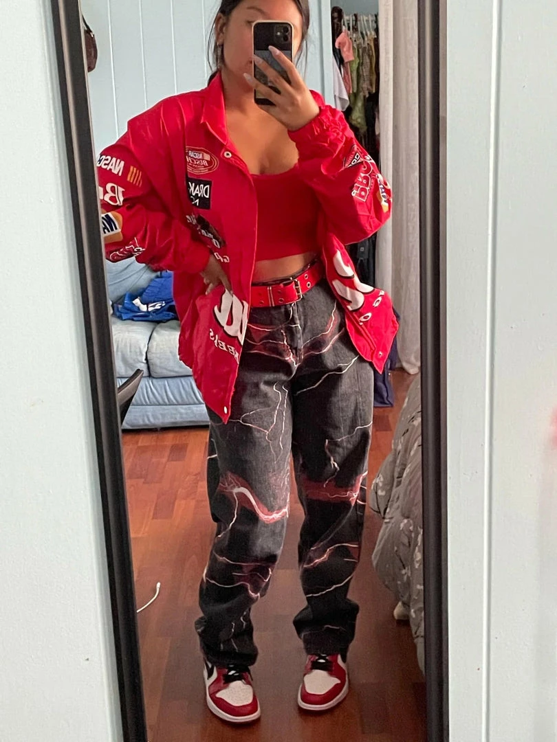 Nascar Racing jackets are the current streetwear trend and this vintage style Budweiser Racing Jacket doesn’t disappoint with its bright red look inspired by the famous american beer it also features a variety of sponsor logos guaranteeing that 90s retro look.