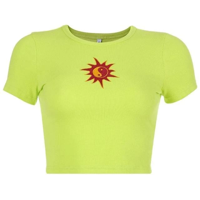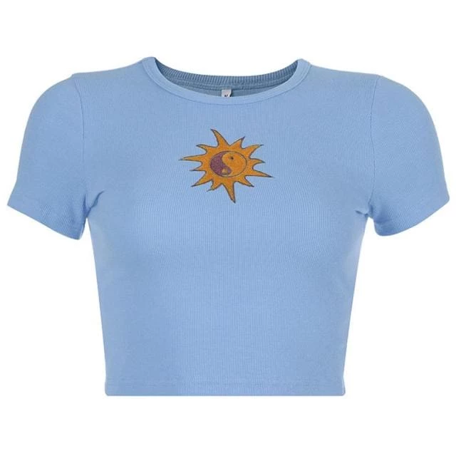 Find the Ying to your Yang in our Ying Yang Crop Top, featuring a baby blue material with a contasting yellow and red ying yang design on the front. Style with a mini skirt and some cute trainers for date night vibes.ย