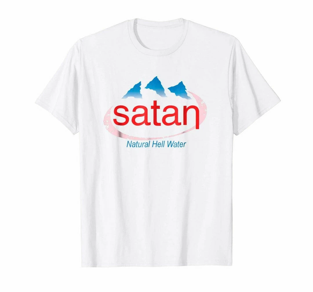 This unique blend of art and fashion repurposes a iconic logo Evian logo to produce this Satan Natural Hell Water T-Shirt! Uses the famous logo the words have been changed to give it a more street wear style that remains recognisable.ย