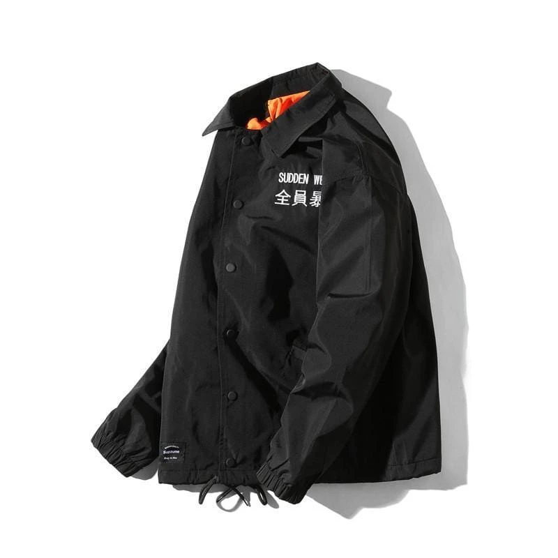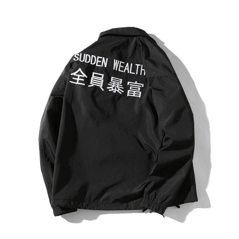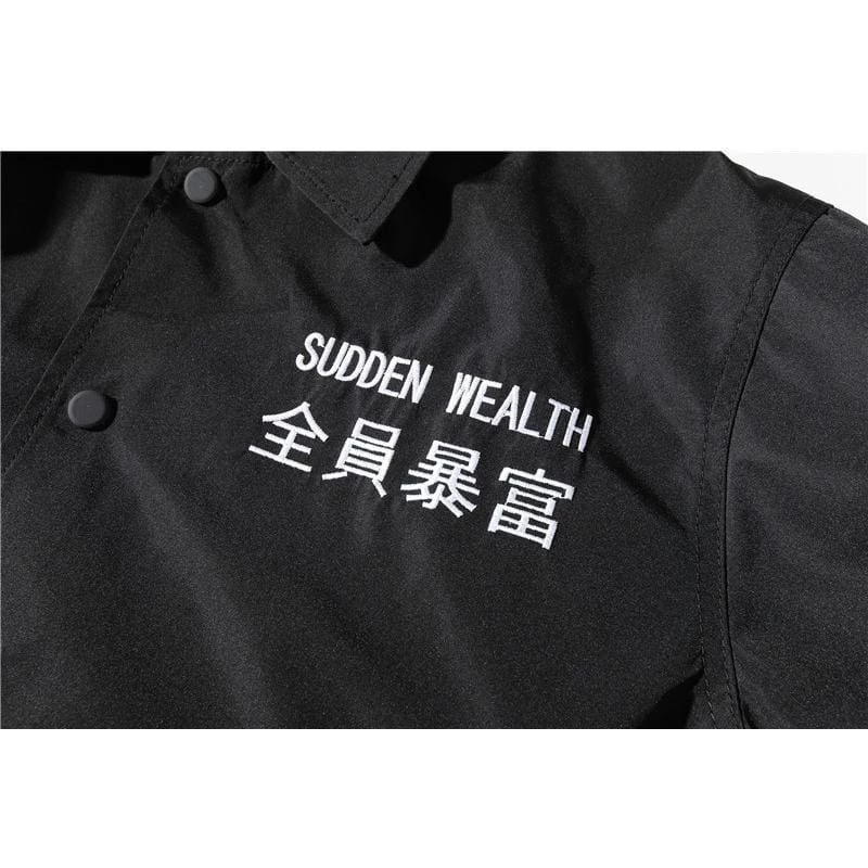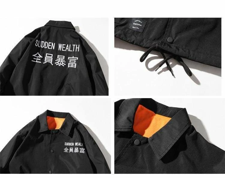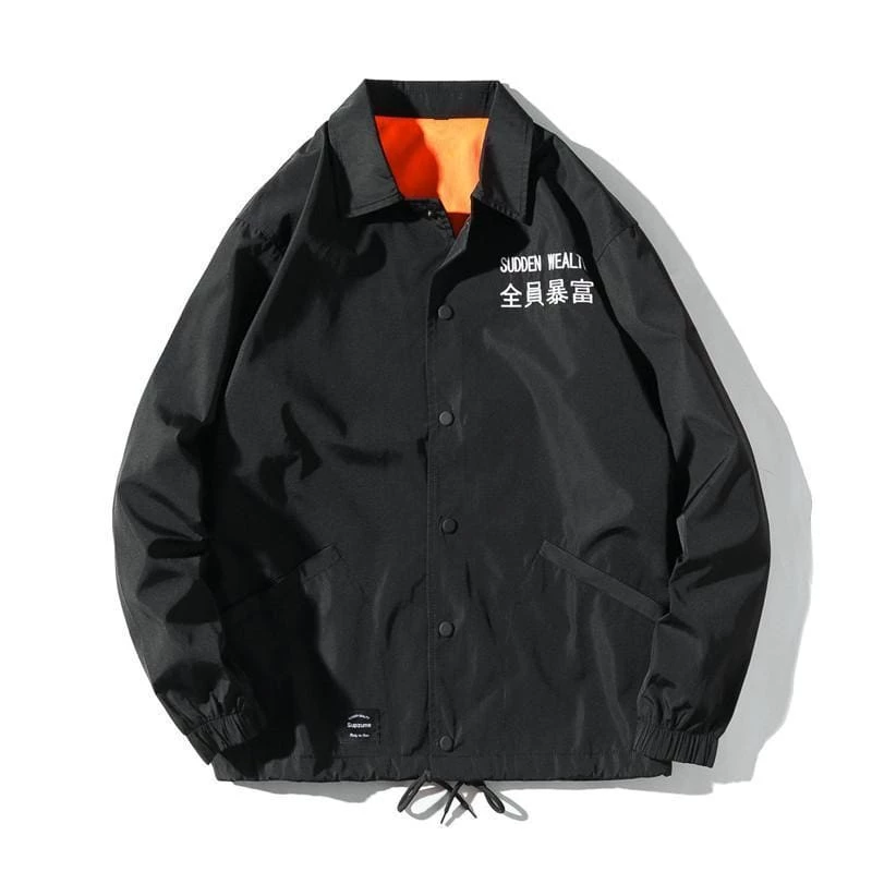 Cop our ‘Sudden Wealth’ coach jacket to make a statement with your outerwear. Available in black with an orange lining and white detailing. Featuring a collar, button up front and adjustable toggle hem. This piece is a perfect addition to your urban collection – it can be dressed up or down.