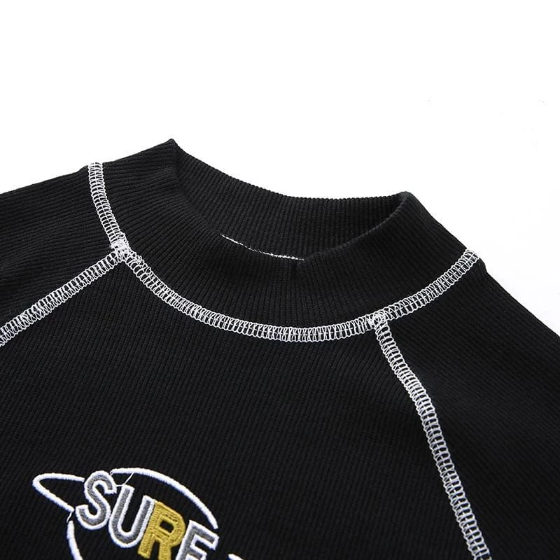 Our Sure Crop Top is a look this season. Featuring a high quality black stretchy material that hugs your figure, high neck and contrast stitching that compliments the simple planet logo, piece with a pair of our joggers for effortless style.
