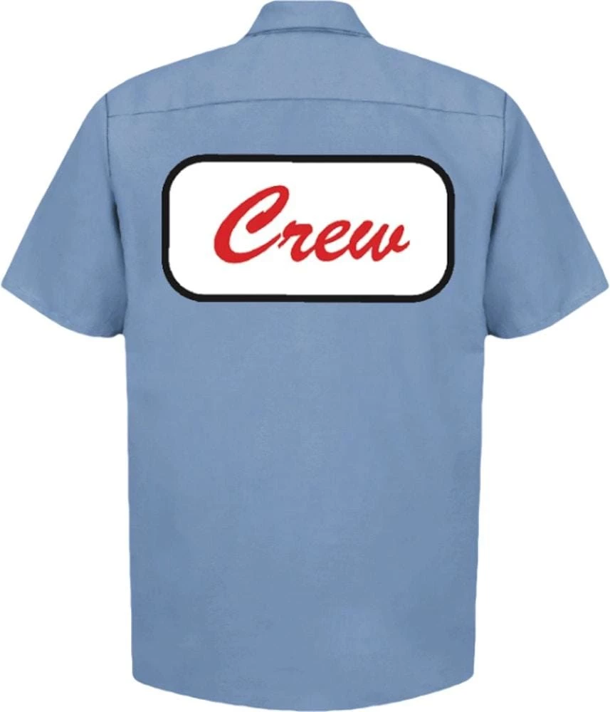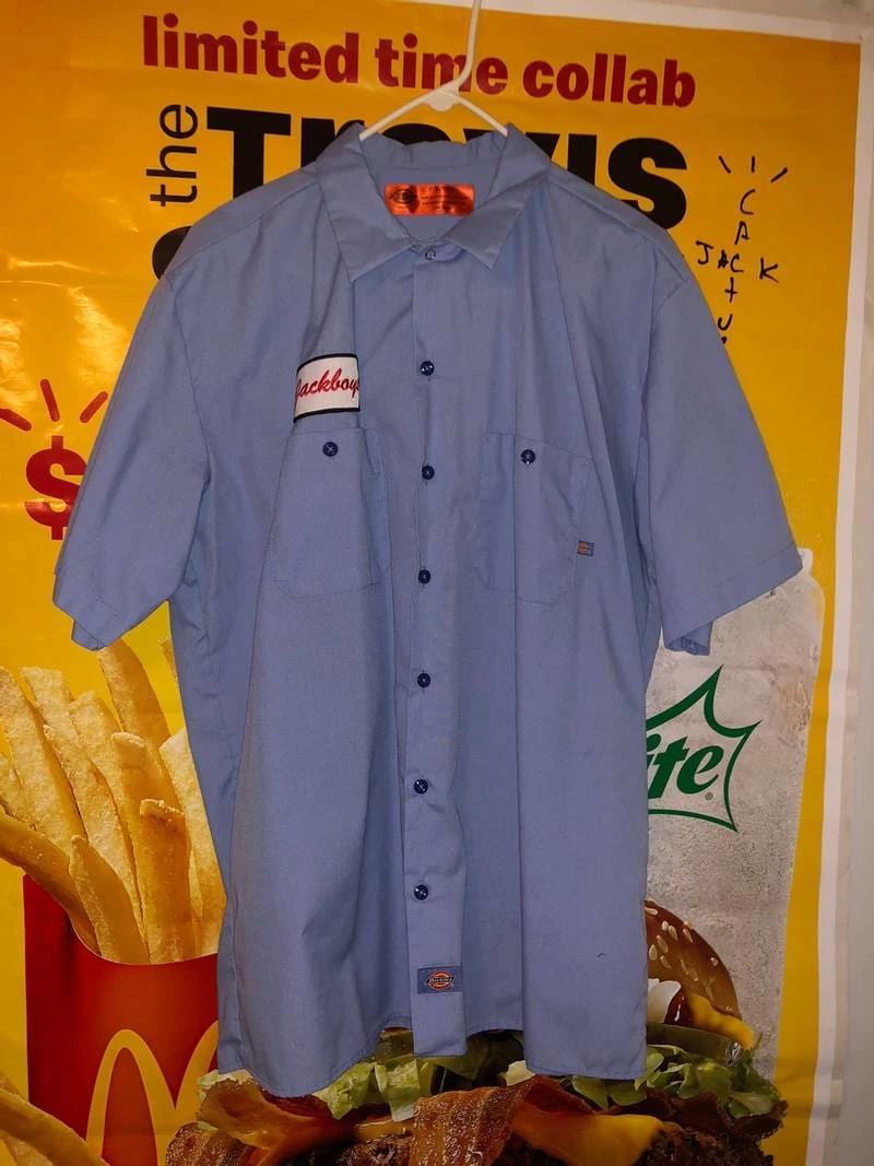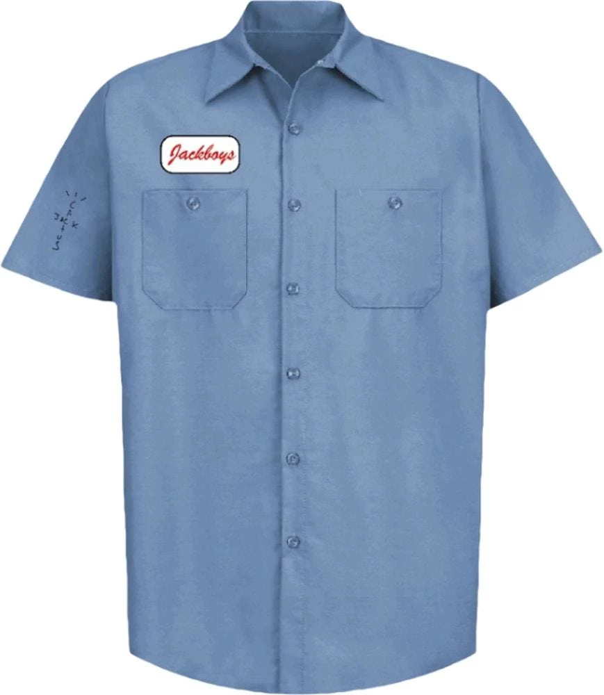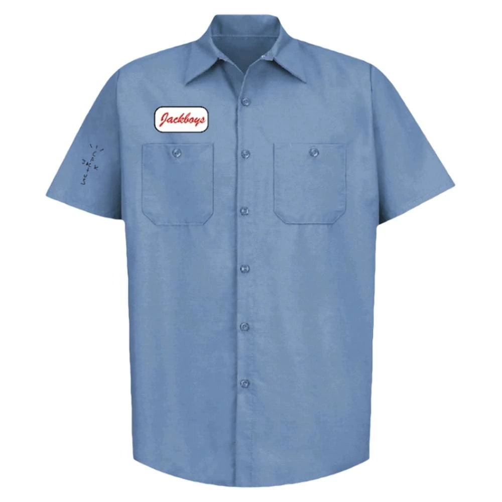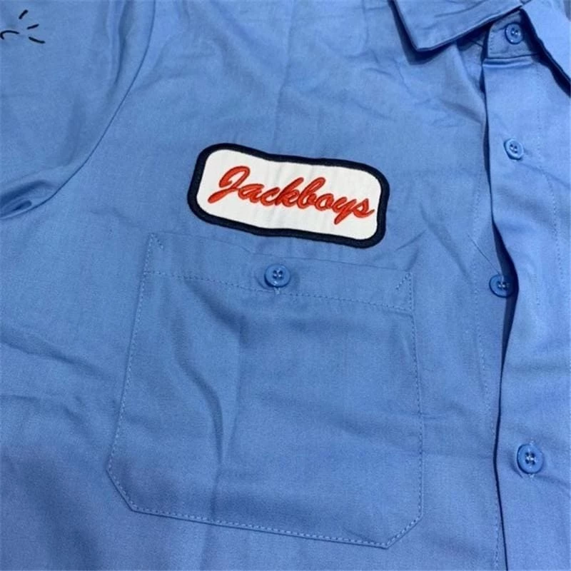 Secure yourself the limited Travis Scott Jackboys Work Shirt in blue! This super cool shirt features custom embroidery with a jack boys badge on the front with crew printed on the back. Time to get the cactus jack look.