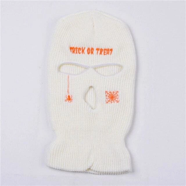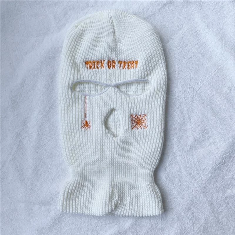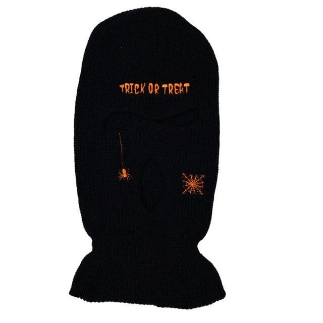 Secure the halloween look and make a statement with our Trick Or Treat Ski Mask! Available in Black Orange and White the Balaclava features custom embroidery with spiders and cobwebs to give you that spooky look!