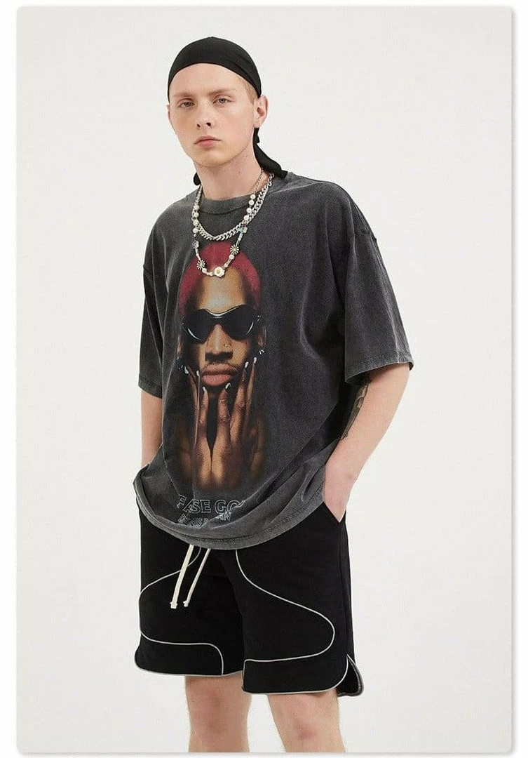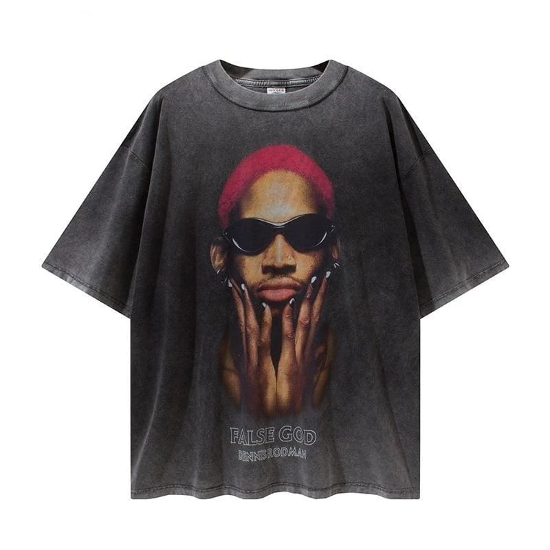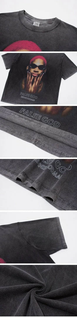 Dennis Rodman is famous for this unique style and with the Vintage Dennis Rodman False God T-Shirt you can capture his look. The design features a large close up of his face with the print “false god” on a premium washed black fabric.Β