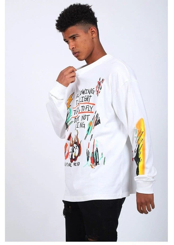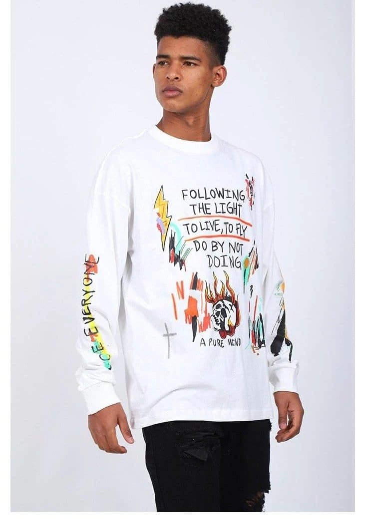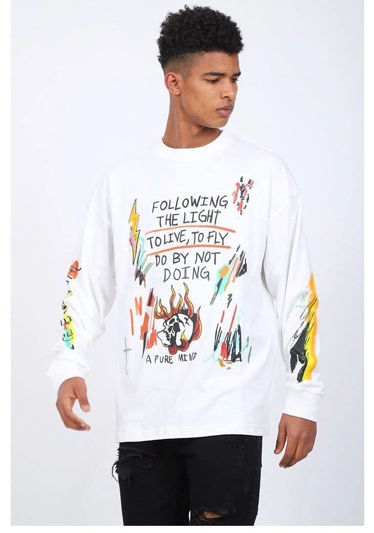 Get the Kanye West look by ‘following the light’ in Yeezy Wes Lang Wyoming Long-Sleeve T-Shirt. Now available in White. The tee features unique designs and phrases like ‘do by not doing’, Famously worn at the Ye listening party in Wyoming.